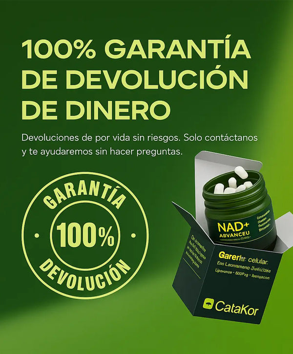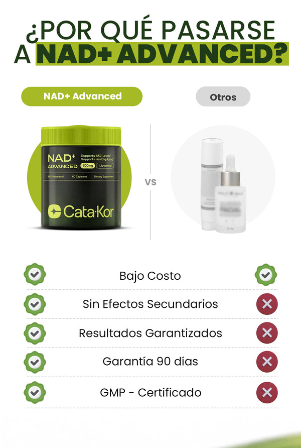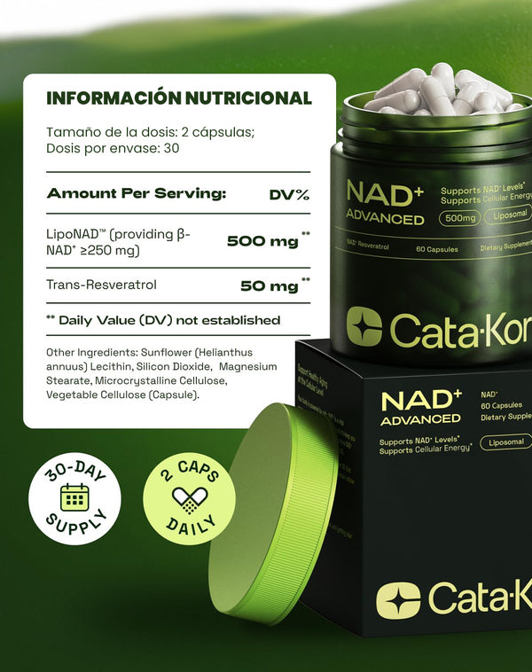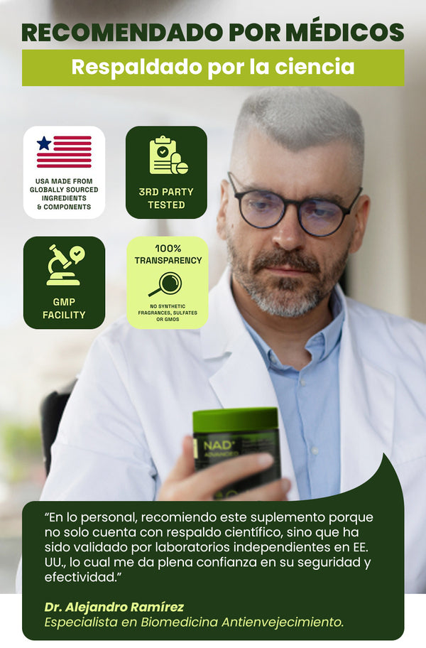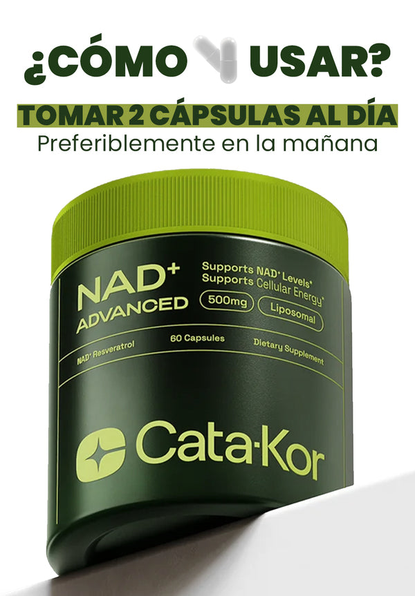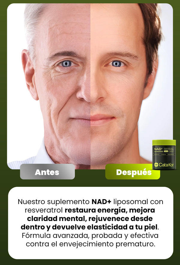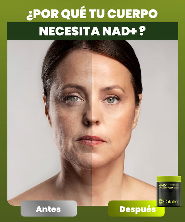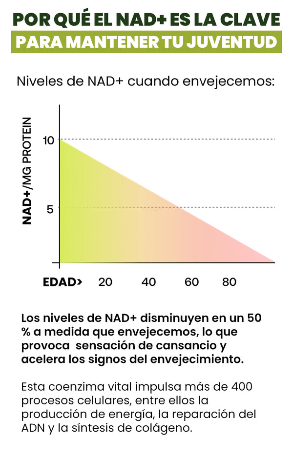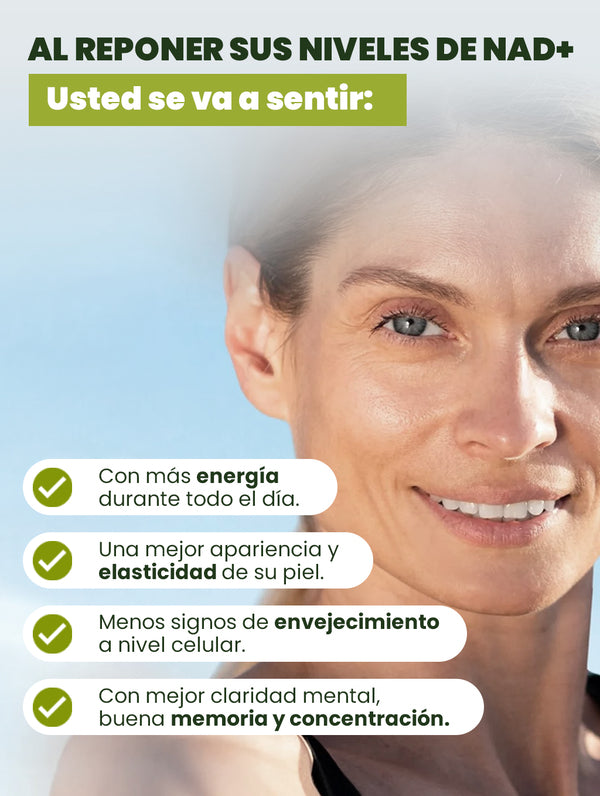 El NAD+ es una coenzima esencial que ayuda a tus células a producir energía. Sus niveles disminuyen con la edad, lo que causa fatiga, envejecimiento prematuro y menor claridad mental.